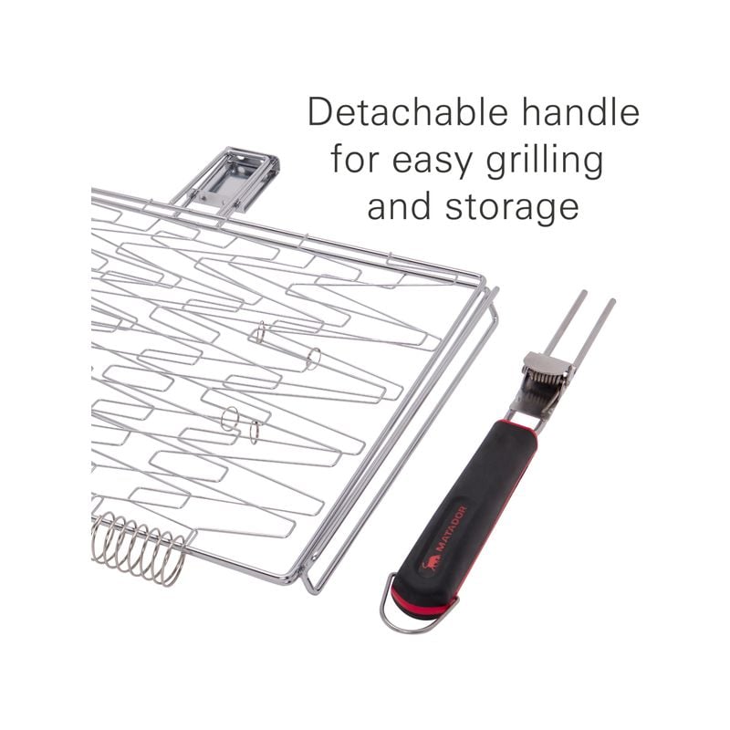 The Matador Flexible Multi-Grill Basket has wire grids that flex to allow you to grill a variety of foods including fish, vegetables, seafood, burgers and grilled toasties. Steel wire frame features a polished chrome finish for easy care and clean up. Features a detachable Matador Ergohex handle with locking mechanism to secure your food when grilling.