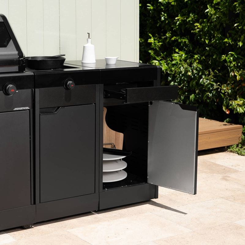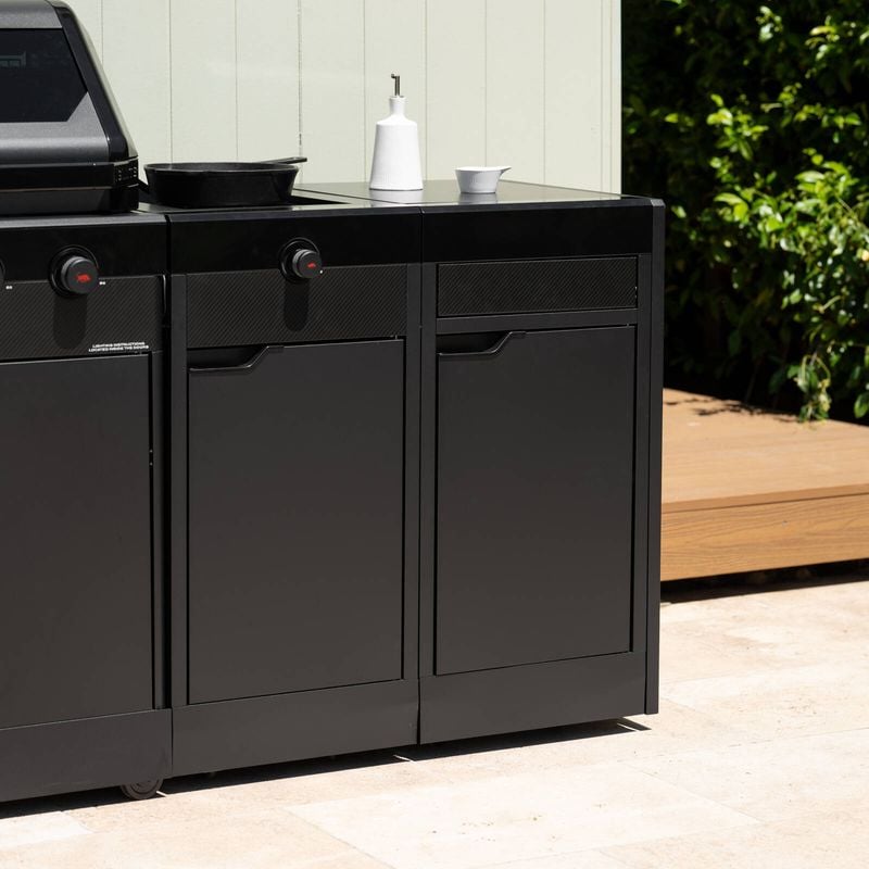 Beneath the surface, this module packs a punch with plenty of storage space—featuring a roomy single cupboard for larger items like cleaning supplies or BBQ tools, and a push-to-open accessory drawer for smaller essentials. Everything has its place, so your kitchen stays neat and ready for action. Smooth-rolling castor wheels make it easy to position the module exactly where you need it, and lock it in place for a stable setup.